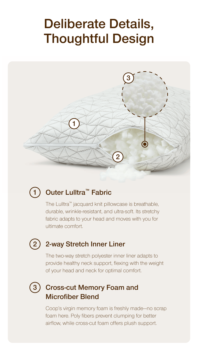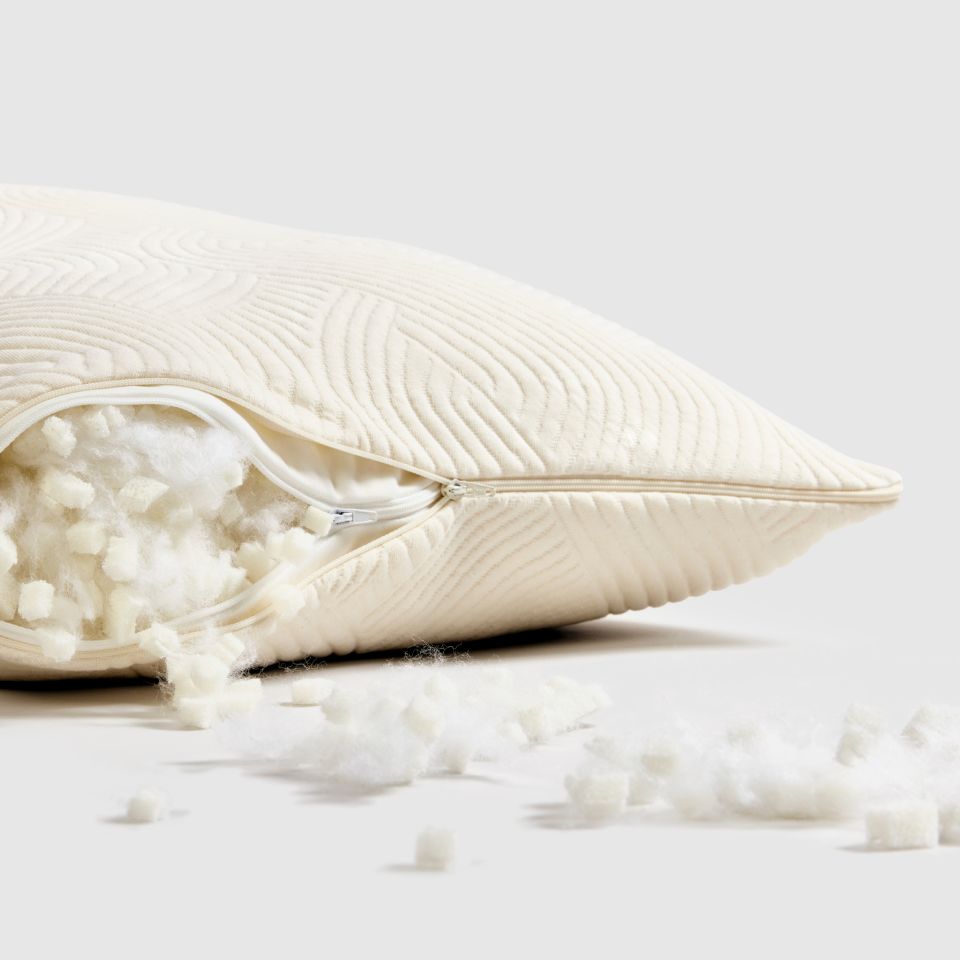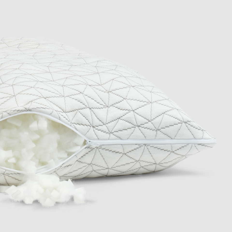 Shredded memory foam pillows are made of tiny, shredded pieces of memory foam filling. The pieces of shredded fill makes the shredded memory foam pillow more breathable than a traditional memory foam pillow made with a more dense fill because there is additional room for the air to circulate between the shredded pieces. At Coop Sleep Goods, we cross-cut our foam vs. shredded because it is even better for consistency, non-clumping, and circulation.
