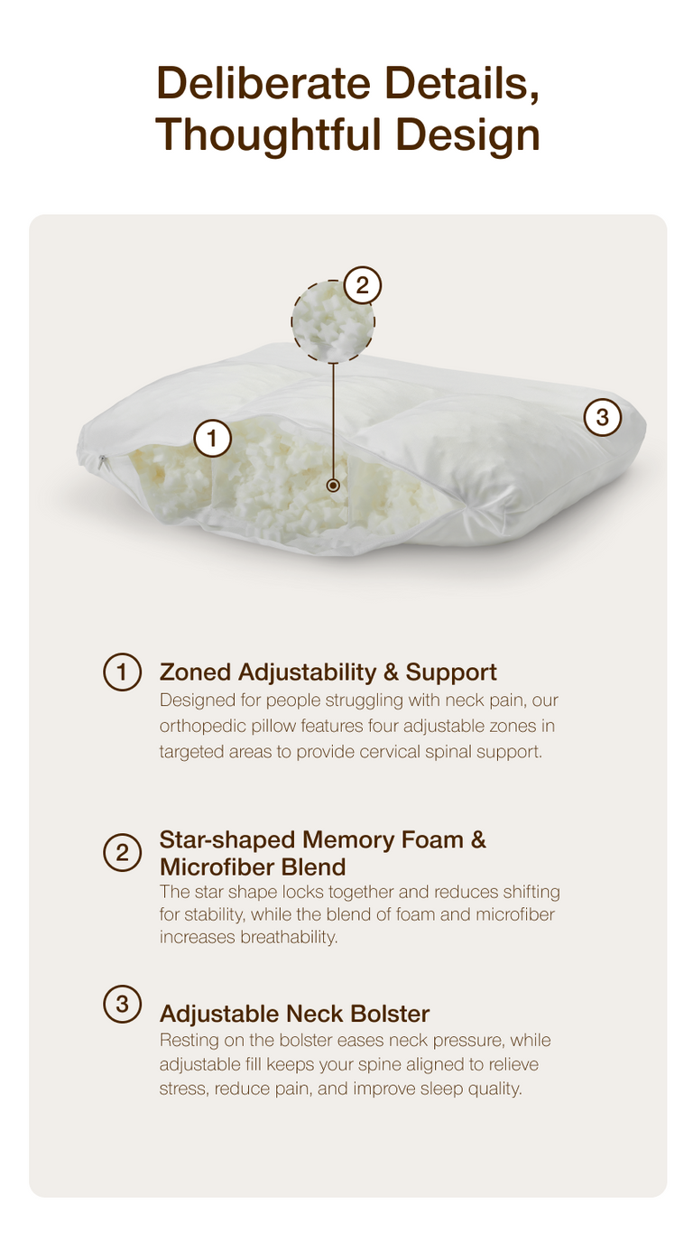 Designed for people struggling with neck pain, our orthopedic pillow features four adjustable zones in targeted areas to provide cervical spinal support to side and back sleepers.