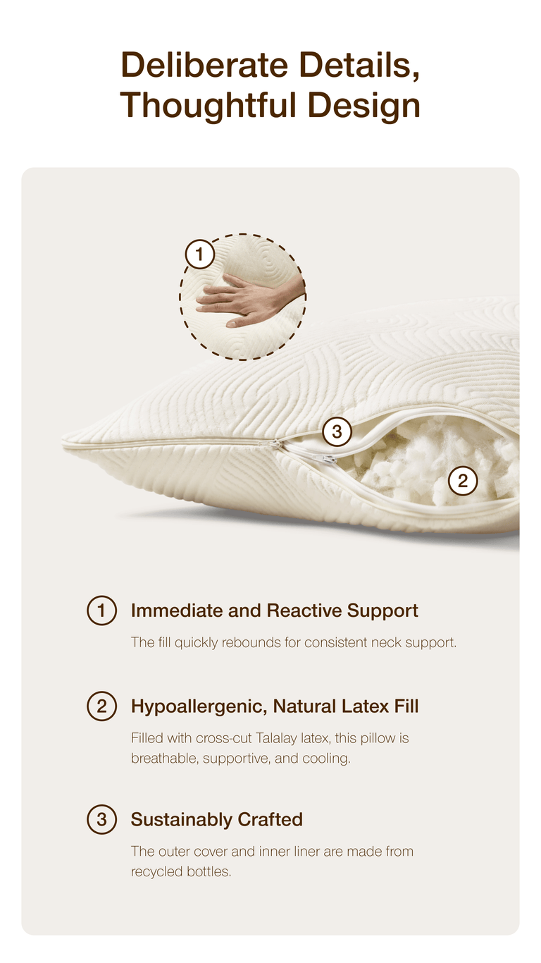 Contrary to memory foam pillows, which tend to mold and hold their shape (and heat), the Coop latex pillow is breathable, bouncy, and fully adjustable. Memory foam often traps heat and can feel too firm or too soft, with no way to change it. Coop’s cross-cut Talalay latex fill promotes airflow and gives responsive support without that “sinking in” feeling. Plus, you can add or remove fill to get the perfect loft — something memory foam just can’t do.