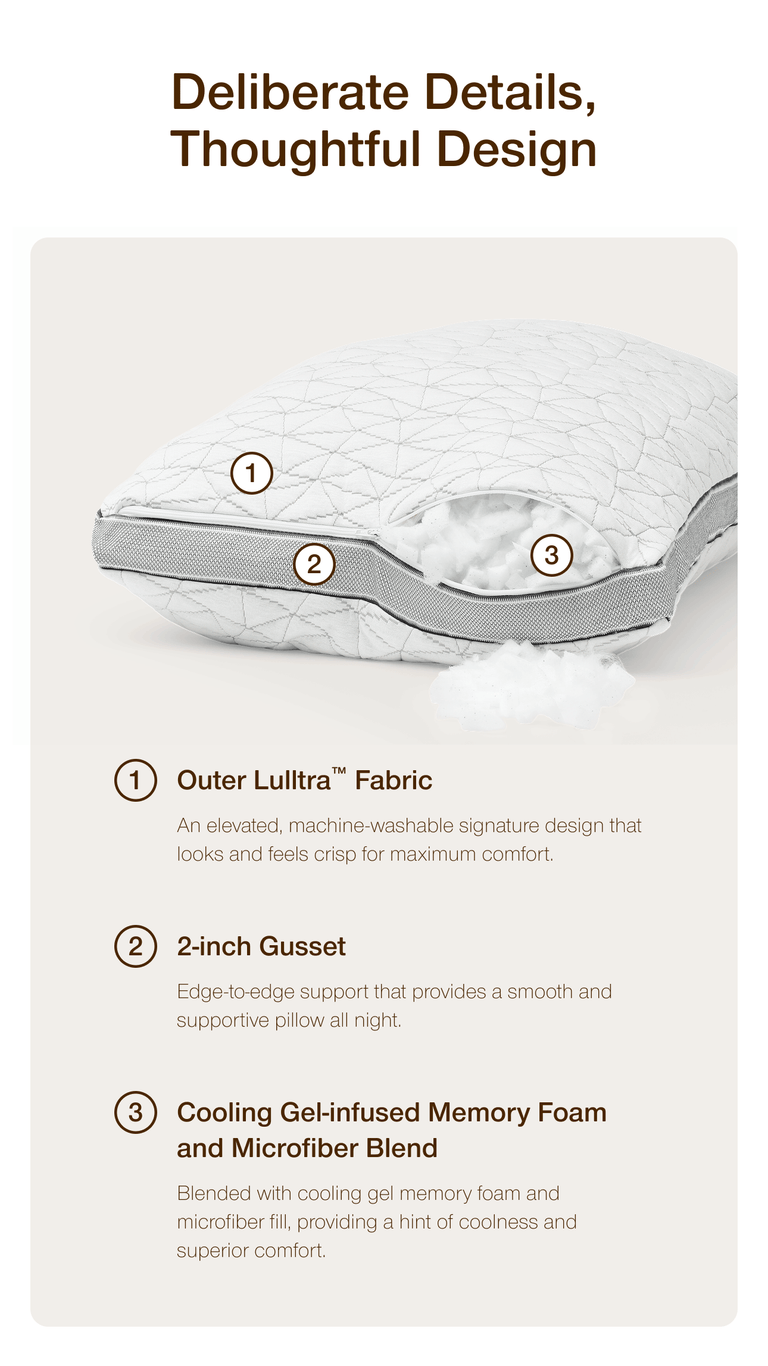 Blended with cooling gel-infused memory foam and microfiber fill for subtle coolness and bold comfort.